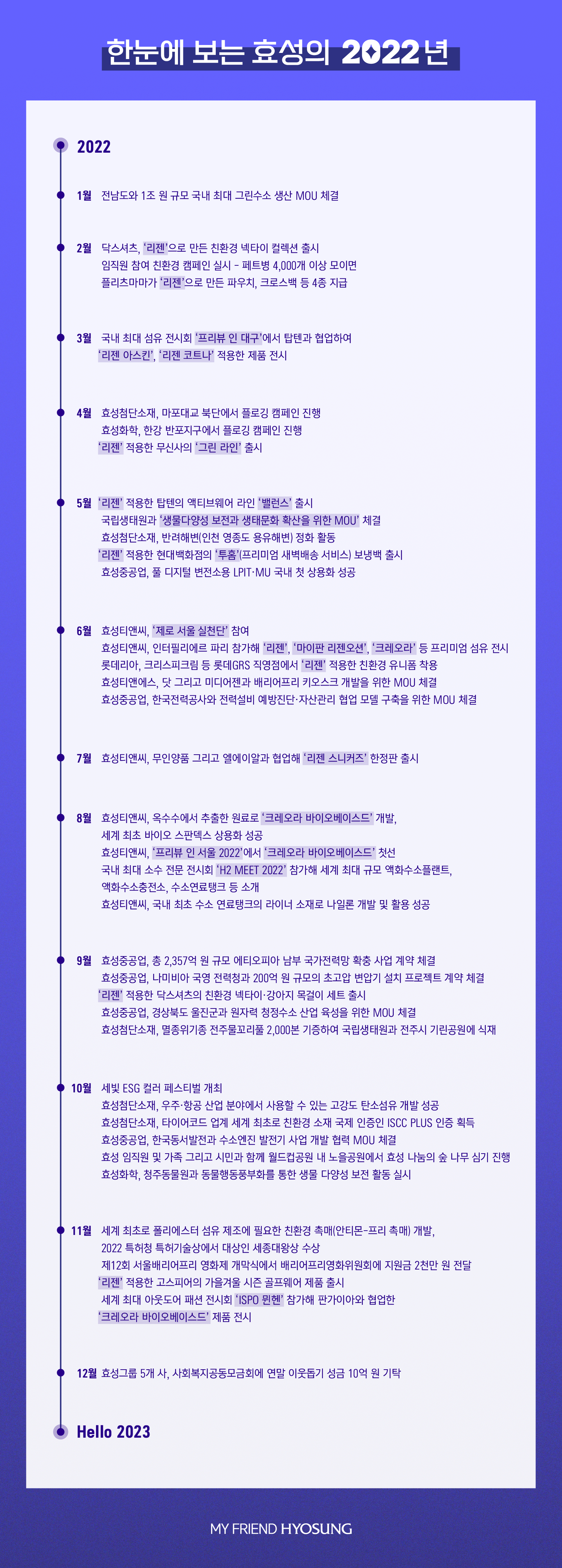 간단하게나마 효성의 2022년을 되돌아보았습니다. 바쁜 하루 속에서는 미처 알지 못했던 목표와 의미를 되찾은 기분입니다. 2023년이 되어도 우리의 하루는 비슷하겠지만, 그 또한 의미 있음을 깨닫습니다. 더 좋은 세상을 위해 움직이는 기업이 되겠습니다. 앞으로도 많은 관심과 응원 부탁드립니다.