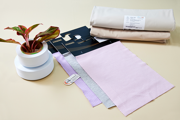 우선, 기존 석탄 대신 옥수수에서 추출한 천연 원료를 가공해 만든 바이오 스판덱스 ‘크레오라 바이오베이스드(creora® bio-based)’ 상용화를 세계 최초로 성공했습니다. 더불어 스위스 제네바에 본사를 둔 세계적인 검사, 검증, 테스트 및 인증기관인 SGS로부터 글로벌 친환경 인증 ‘에코 프로덕트 마크’까지 획득했죠. 크레오라 바이오베이스드를 사용하면 기존 스판덱스 대비 물 사용량은 39%, 이산화탄소(CO2) 배출량은 23%나 줄일 수 있습니다. 최근 세계 최대 아웃도어 패션 전시회 ‘ISPO 뮌헨’에서 판가이아(PANGAIA)와 협업한 크레오라 바이오베이스드 제품 전시하기도 했습니다.