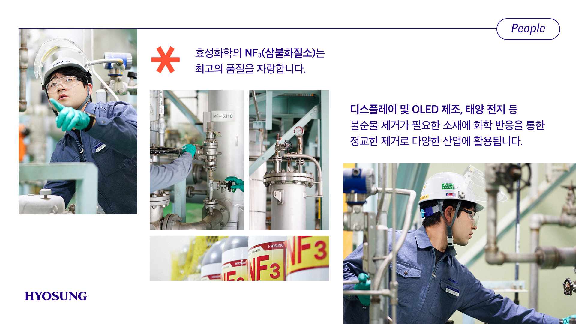 효성의 NF₃는 순도 99.995% 이상으로 고순도 정체 기술 등 최고의 품질을 자랑합니다.