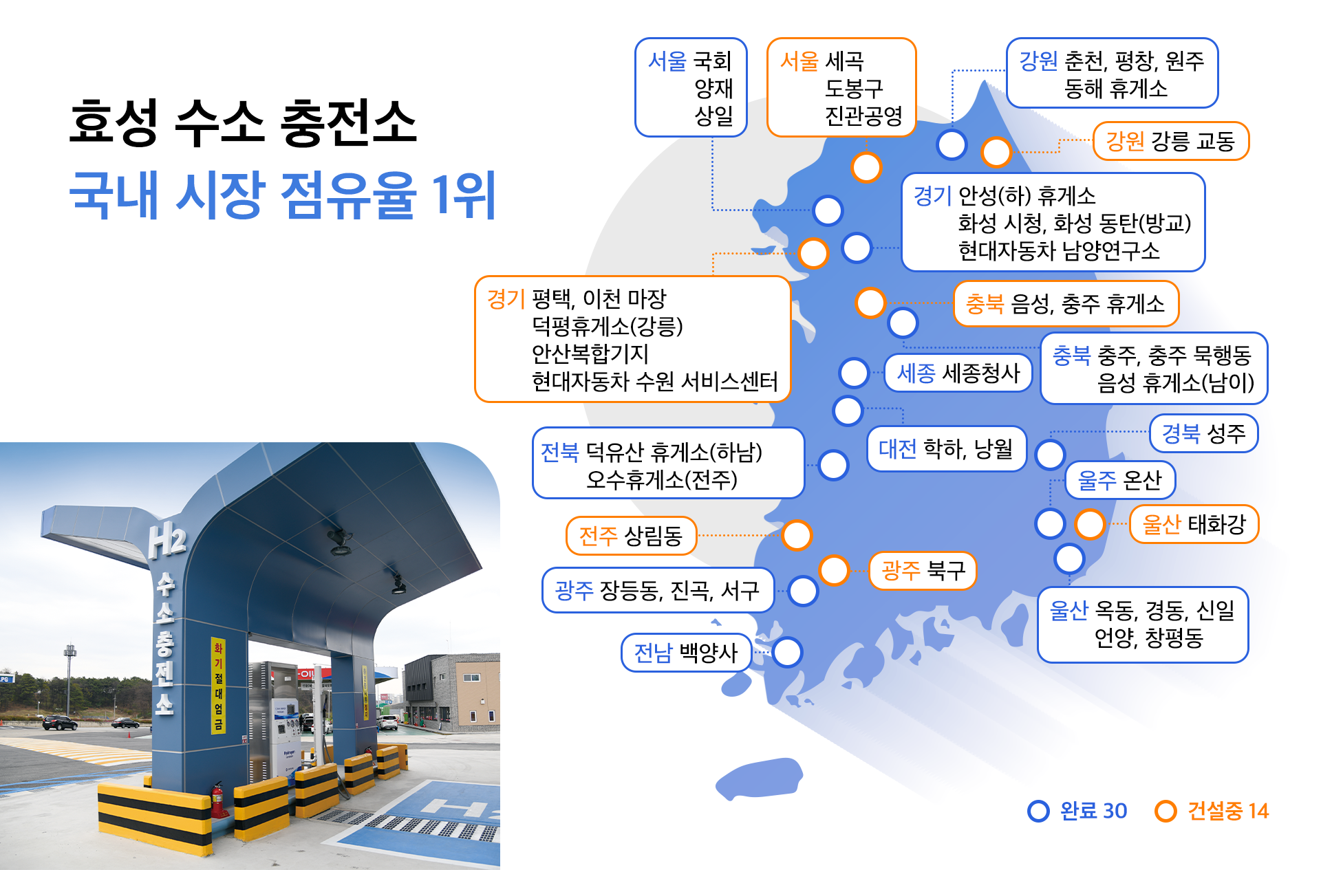 지금은 전국 주요 도시에 34개 기체 수소충전소를 세워 수소에너지 상용화에 앞장서고 있습니다.