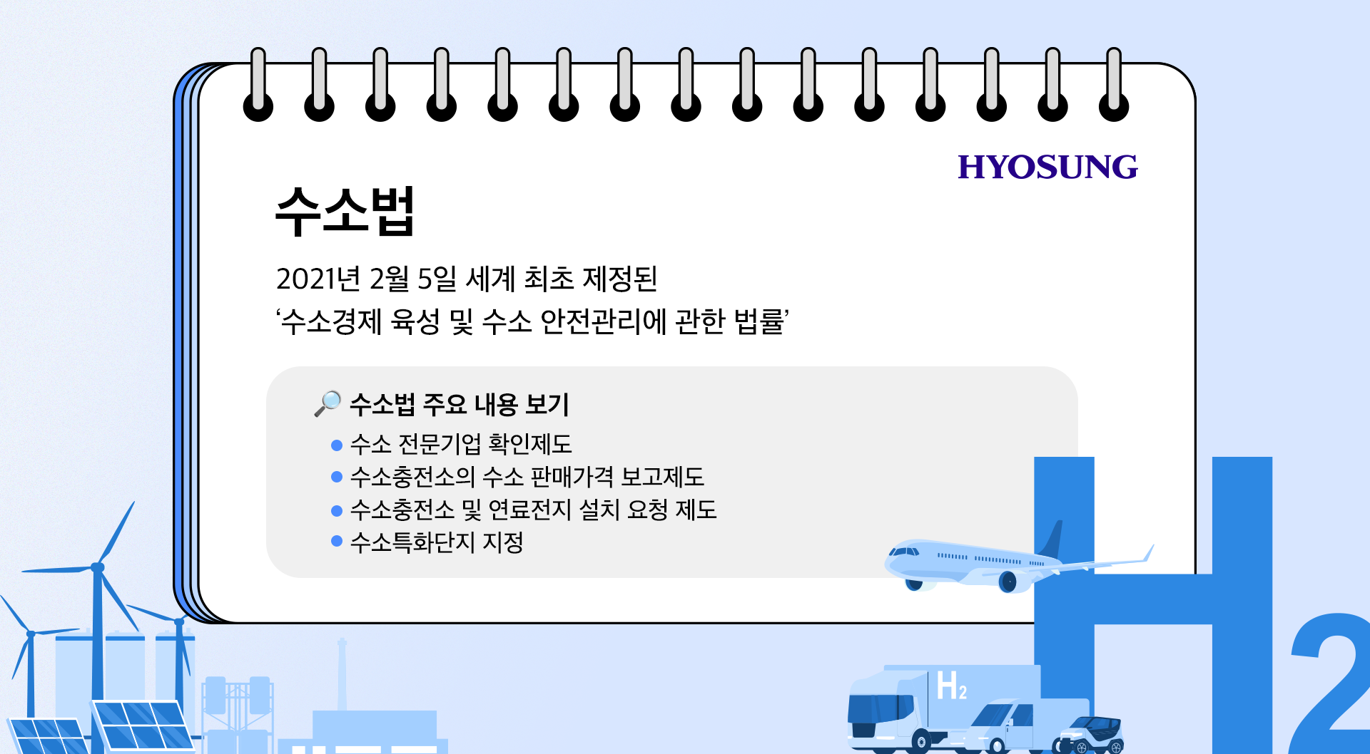 정식 명칭은 ‘수소 경제 육성 및 수소 안전관리에 관한 법률’, 2021년 2월 5일부터 시행 중에 있습니다.