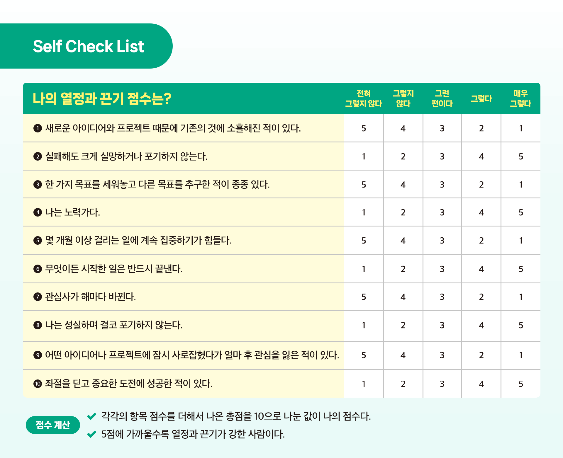 다음의 테스트를 통해 스스로를 점검하고 열정과 끈기를 조금씩 강화 시켜보시죠!!