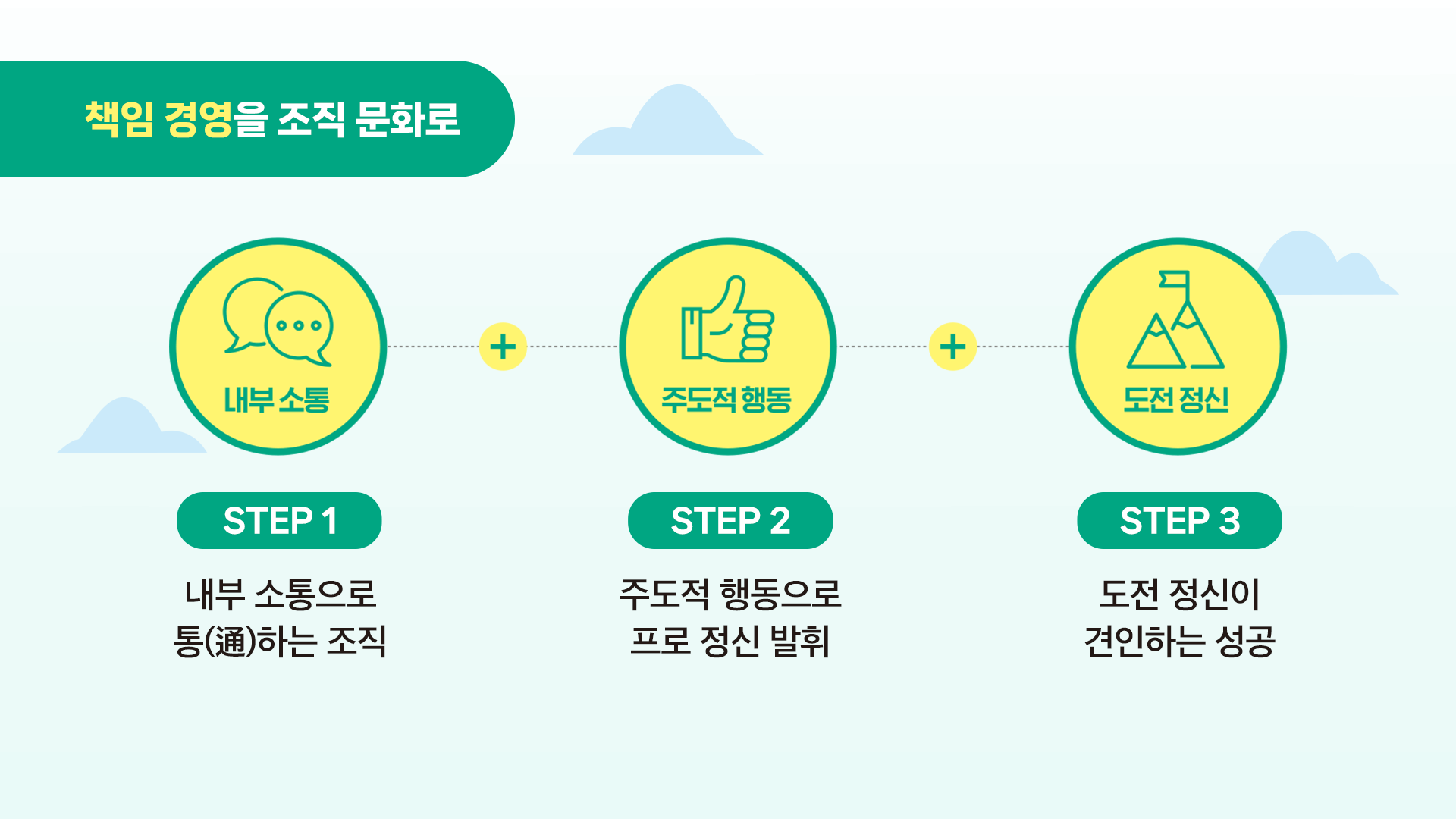 내가 맡은 임무는 반드시 수행하고 결과에 책임지는 자세를 가집니다. 이제는 일방적인 지시로 움직이는 조직이 아니라 솔직하고 긴밀한 소통 방식으로 변화할 때라는 것을 잘 이해하고, 구성원 한 사람 한 사람이 주도적 행동으로 책임을 다할 때 열정과 프로 정신도 발휘될 것으로 생각해요.
