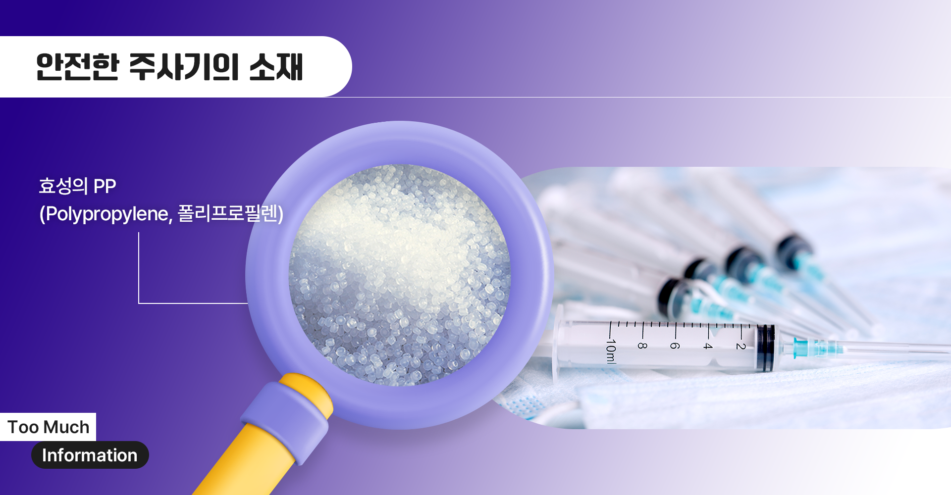 백신 접종에 사용되는 일회용 주사기는 안정성 측면에서 여러 요건을 갖춰야 하는데요. 충격에 쉽게 파손되지 않아야 하고, 소재가 투명해야 하며, 고온에 견딜 수 있어야 해요. 이 모든 것을 갖춘 소재가 바로 효성화학이 만드는 ‘PP(Polypropylene, 폴리프로필렌)’입니다.