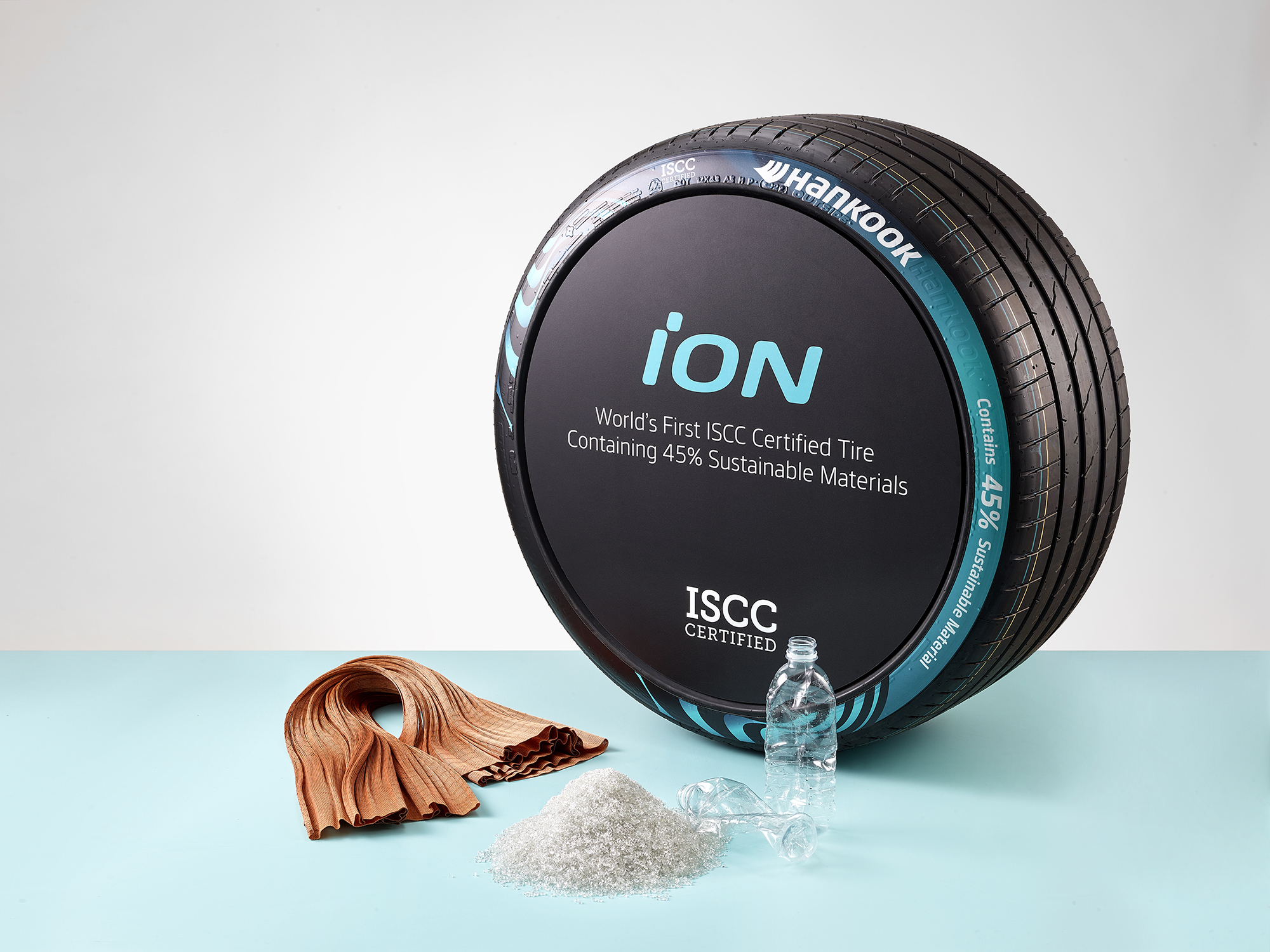 이번에 한국타이어가 개발한 아이온 모델은 효성의 타이어코드를 포함해 바이오·서큘러·바이오-서큘러 폴리머, 바이오 기반 실리카 등 지속 가능 원료가 45% 적용됐고 타이어 최초로 ISCC PLUS 인증 로고가 각인됐습니다.