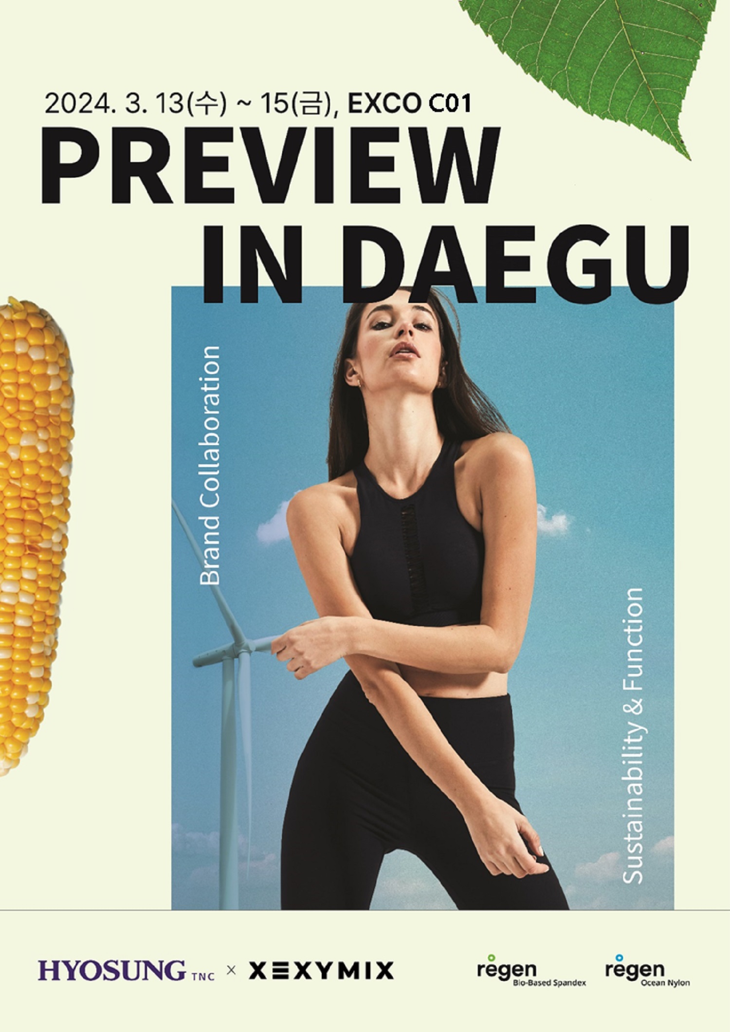 효성티앤씨가 오는 13일부터 15일까지 대구 EXCO에서 개최되는 국내 최대 섬유 산업 전시회인 2024 대구국제섬유박람회(Preview in Daegu; PID)에서 국내 1위 애슬레저 브랜드인 젝스믹스 와의 콜라보 패션 제품을 대거 선보입니다.