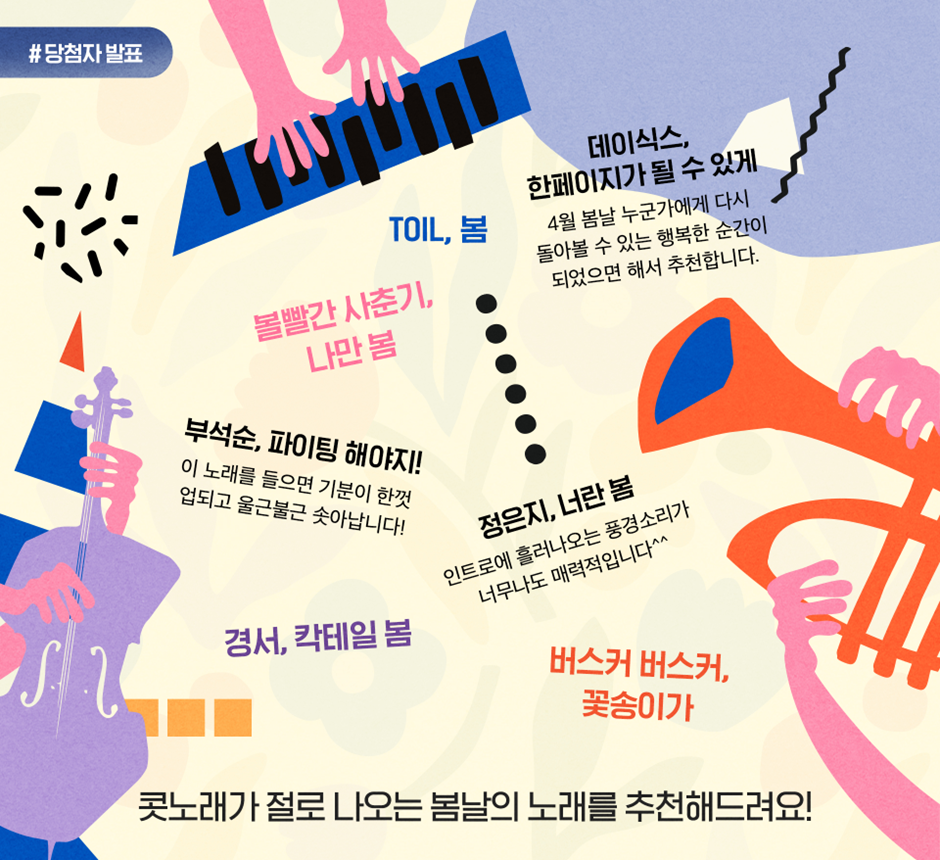 많은 분들이 #봄노래추천 이벤트를 통해 서정적인 노래부터 신나는 노래까지 다양한 노래를 많이 추천해 주셨는데요!