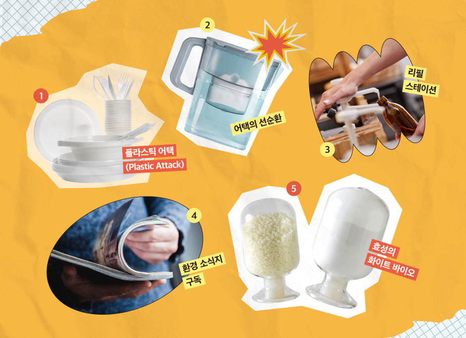 그래서 오늘 HYOSUNG NOW에서는 ‘불필요한 것들과의 싸움: 플라스틱 어택’이라는 주제를 가지고 일상생활에서 지구에 해가 되는 것들을 해결하기 위해서 펼쳐지는 행동들을 명확한 단어로 재정의함으로써 여러분이 지구를 지키기 위해 나아갈 방향에 조금이나마 도움을 드리려고 합니다😊