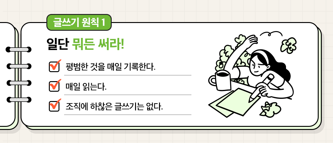 조금은 지루한 작업이어도 매일 읽어둔다며 글쓰기에 반드시 도움이 되며, 읽는 것을 넘어 필사를 실행한다면 더할 나위 없겠죠?!