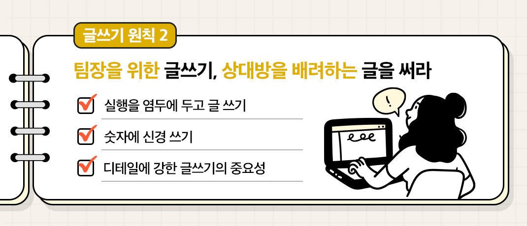 글쓰기의 독자가 팀장이라는 것을 늘 염두에 두고 ‘실행’이 가능한 디테일한 글을 쓴다면, 팀의 리더인 팀장에게 인정과 신뢰를 받는 팀원으로 자리 잡을 수 있을 겁니다😊