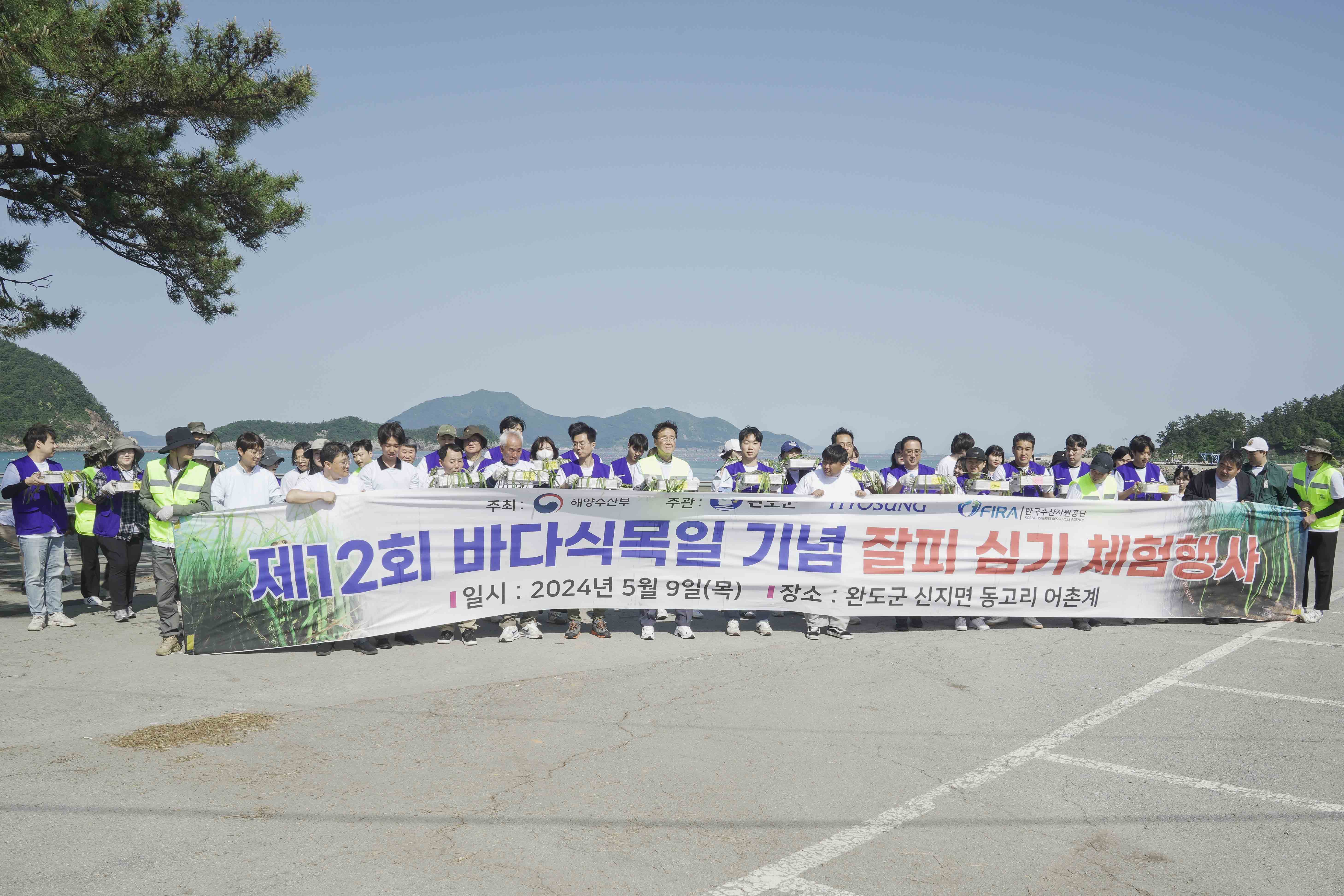 효성그룹(㈜효성, 효성티앤씨㈜, 효성첨단소재㈜, 효성중공업㈜, 효성화학㈜) 임직원과 완도군, 한국수산자원공단(FIRA) 남해본부, 동고리 어촌 주민 총 60여명은 5월 9일 바다숲 조성을 위한 잘피 2,000주를 직접 이식했습니다.