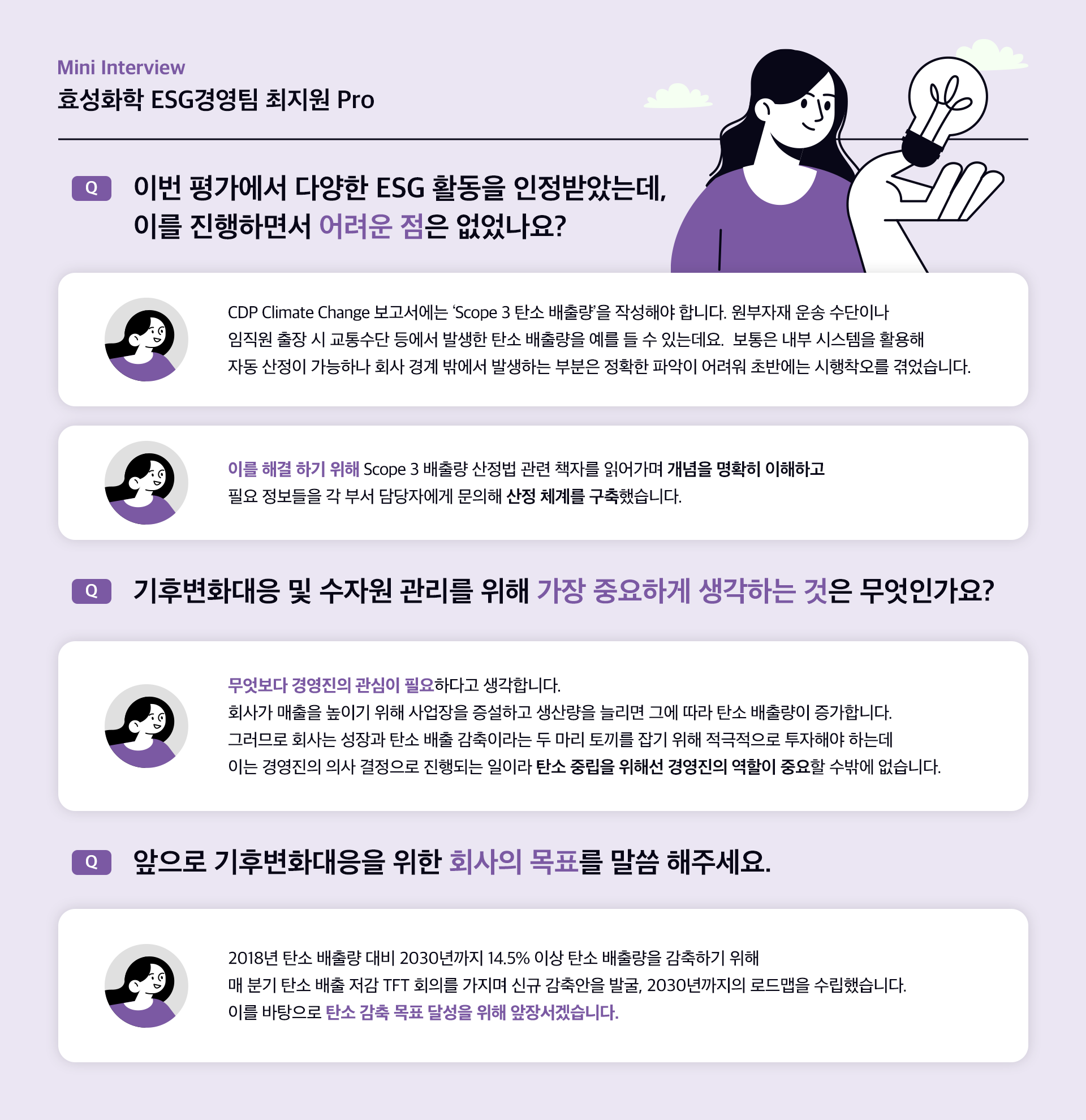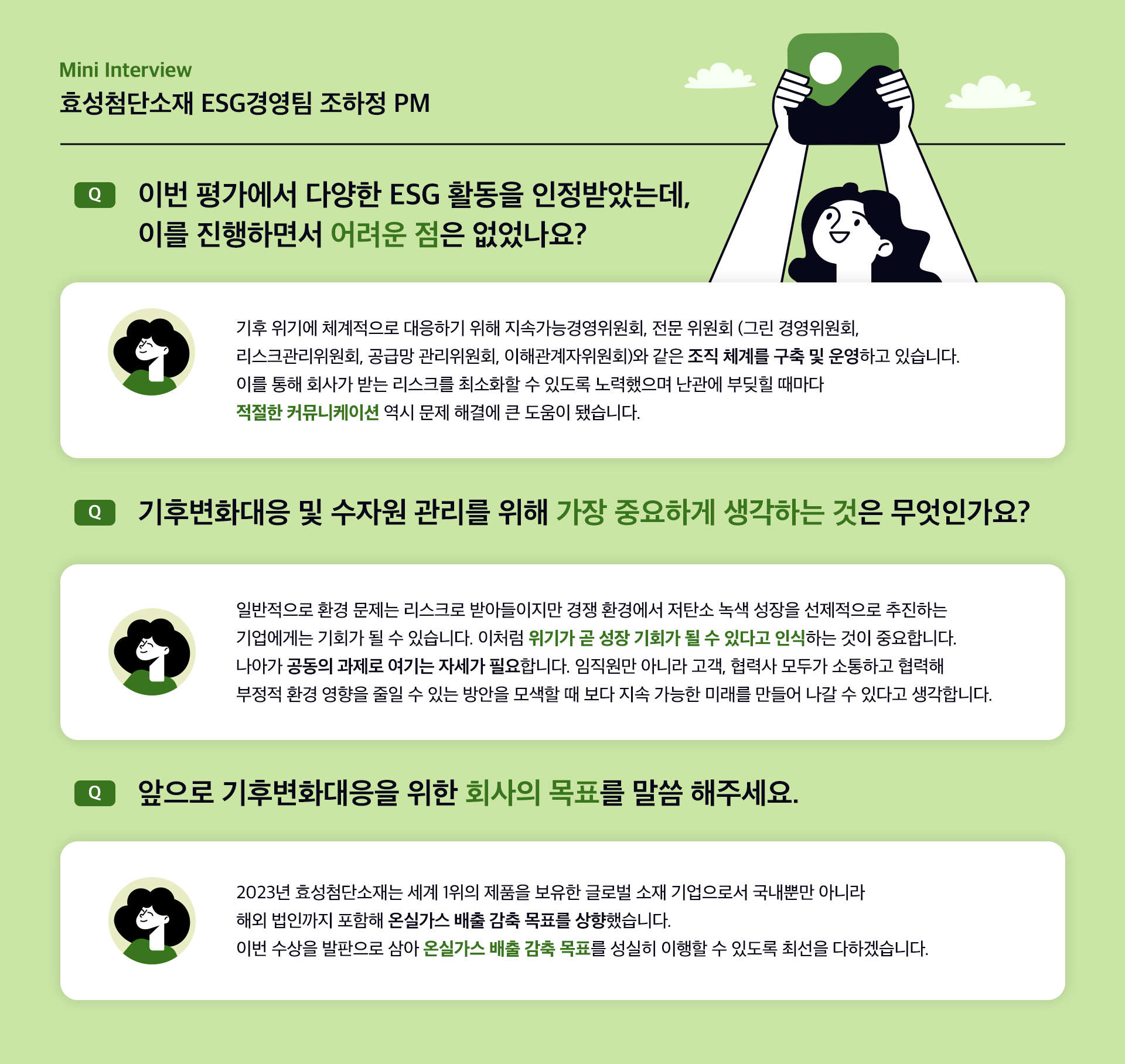 기후변화대응에 앞장서 온 효성화학과 효성첨단소재의 이야기를 통해 효성이 ESG 경영 실천을 위해 어떻게 나아가고 있는지 알 기회가 되었길 바라요 :)