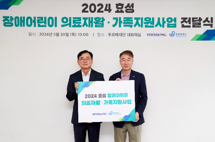 효성이 5월 30일 종로구에 위치한 푸르메재단을 찾아 ‘장애 어린이 의료재활과 가족 지원’ 사업을 위한 후원금 1억 3천만 원을 전달했습니다. 효성의 후원금은 저소득층 장애 어린이·청소년의 재활치료, 비장애 형제·자매의 심리치료와 교육비, 효성 임직원 가족과의 동반 가족 여행 등에 사용될 예정입니다.