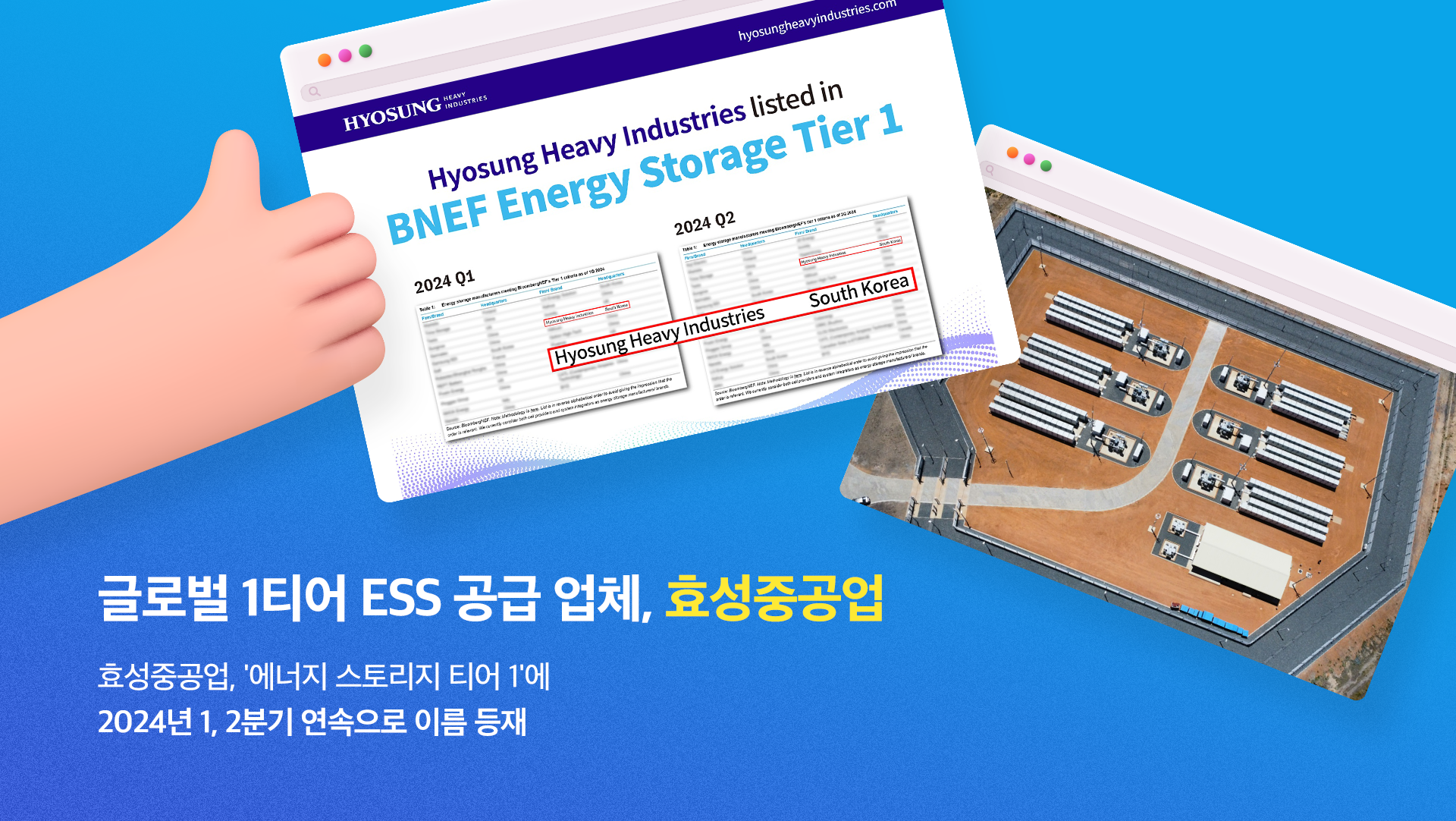 효성중공업이 Bloomberg New Energy Finance(BNEF)가 발표하는 '에너지 스토리지 티어 1(Energy Storage Tier 1)'에 2024년 1, 2분기 연속으로 이름을 올렸습니다. 글로벌 ESS 시장에서 우수한 배터리 공급기업과 시스템 공급 및 운영 역량을 갖춘 기업을 선별해 발표하는 지표입니다.