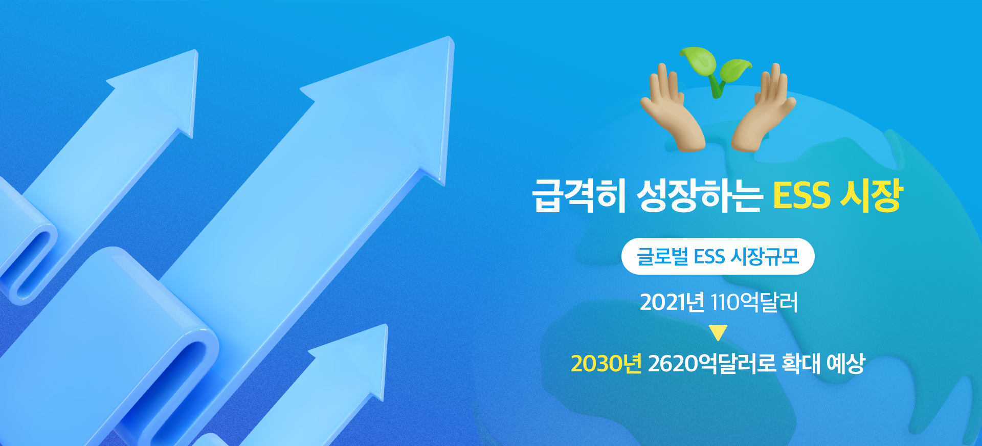 ESS(Energy Storage System)는 풍력, 태양광 등 신재생 에너지를 소비하고 남은 여분의 에너지를 안전하게 저장한 후 필요한 시점에 저장된 에너지를 다시 공급하는 시스템입니다.