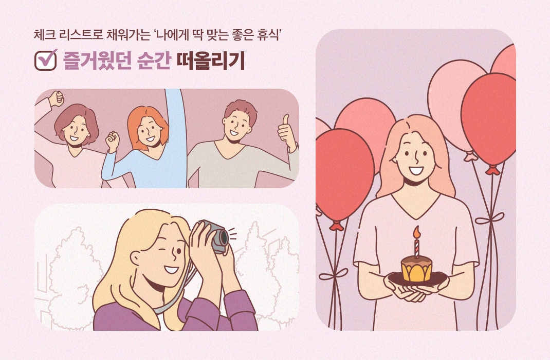 그 순간들의 기억을 더듬으며 이글을 봐주세요! 그 기억이 바로 여러분의 현명한 휴식법을 찾을 수 있는 가장 좋은 길이 될 것입니다😊 이처럼 이번 일잘러 프로젝트에서는 여러분이 ‘나에게 딱 맞는 좋은 휴식’ 채워 나갈 수 있도록 체크리스트를 제시해드릴 게요!