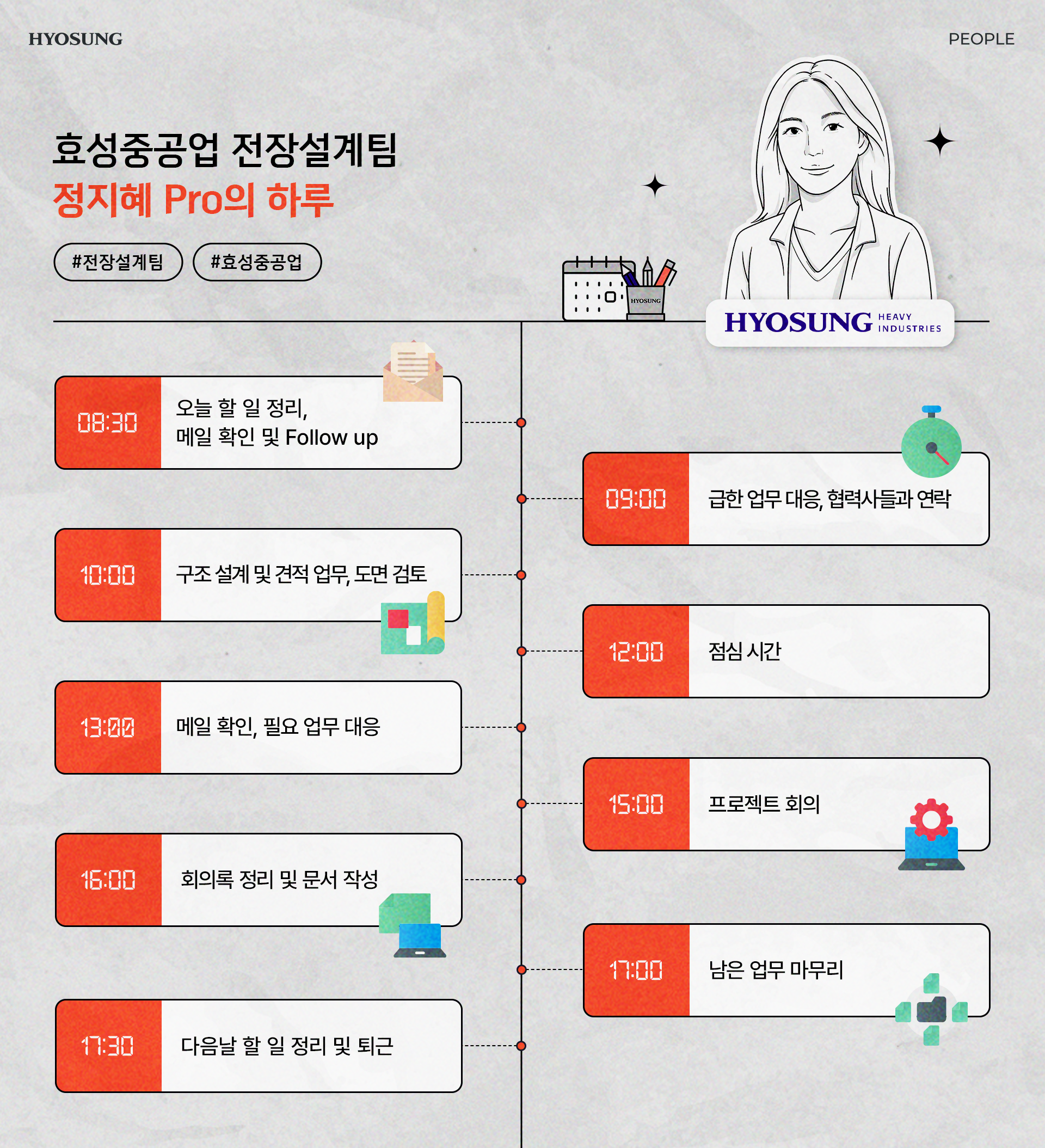 하루 일과는 딱 정해진 루틴처럼 흘러갑니다. 특히 설계팀은 메일 확인, 설계, 협력사 커뮤니케이션, 회의, 문서화까지 전 과정을 꼼꼼히 챙겨야 합니다.