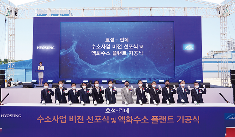 국내 수소 충전 시스템 점유율 1위인 효성중공업과 글로벌 가스 및 화학 전문 기업 린데가 6월 21일, 효성화학의 울산 용연공장 부지에서 수소 사업 비전 선포와 액화수소 플랜트 기공식을 개최했습니다. 조현준 회장은 “수소에너지는 인류의 미래를 바꿀 에너지 혁명의 근간으로 지속적인 투자를 통해 수소에너지로의 빠른 패러다임 전환을 이끌어나가겠다”며 “효성의 역사가 시작된 울산에서 백 년 효성으로 나아갈 새 장을 열게 돼 감회가 새롭다”고 소감을 전했습니다.